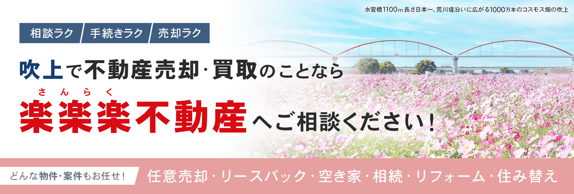 当社は、鴻巣市吹上を中心に、売買・賃貸・管理まで幅広く対応する地域密着型の不動産会社です。売却をお考えの方はもちろん、物件をお探しの方にも最適なご提案を行っています。「相談ラク・手続きラク・売却ラク」をモットーに、初めての方でも分かりやすく丁寧にサポート。任意売却やリースバック、空き家・相続・住み替え、リフォームまで、どんな物件・案件もお任せください!吹上で不動産売却・買取のことなら、楽楽楽不動産へぜひご相談ください。